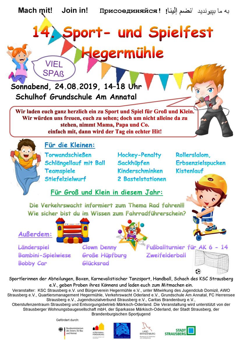 Veranstalter: KSC Strausberg e.V. und Bürgerverein Hegermühle e.V., unter Mitwirkung des Jugendclub Domizil, AWO Strausberg e.V., Quartiersmanagement Hegermühle, Verkehrswacht Oderland e.V., Grundschule Am Annatal, FC Herrensee Strausberg e.V., Jugendsozialverbund Strausberg e.V., Caritas Brandenburg e.V.,