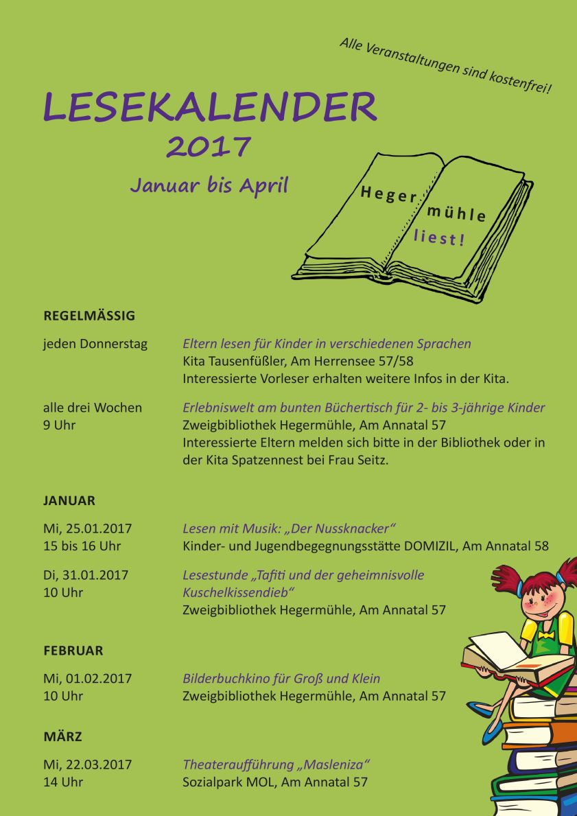 Der aktuelle Lesekalender informiert über kleine und größere Veranstaltungen und Angebote rund um das Thema Lesen in Hegermühle und wird im Wohngebiet als auch in wichtigen Einrichtungen der gesamten Stadt Strausberg verteilt.