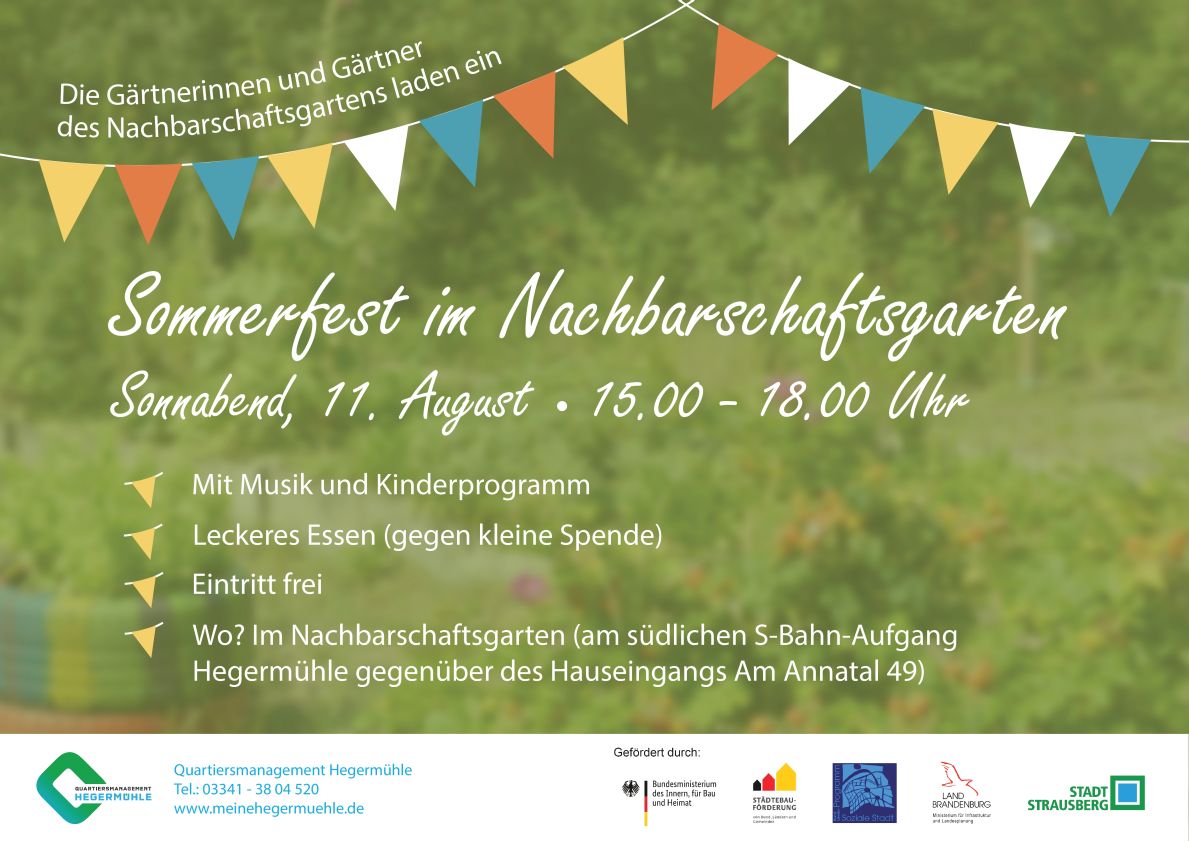 Die Gärtnerinnen und Gärtner des Hegermühler Nachbarschaftsgartens laden herzlich ein zu einem kleinen Sommerfest im August. Die Gäste erwartet u. a. ein Kinderprogramm und Leckeres aus der Gartenküche. Und natürlich informieren die Gärtnerinnen und Gärtner gern über den Nachbarschaftsgarten und diesjährige Neuerungen wie das Hochbeet der Grundschule Am Annatal und das frisch eingezogene Bienenvolk.