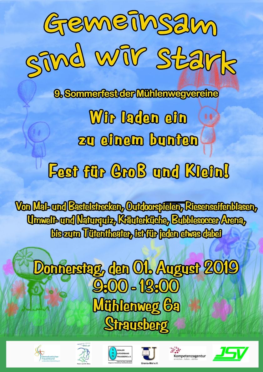 Am Donnerstag den 1. August feiert der Mühlenwegverein unter dem Motto „Gemeinsam sind wir stark“ das 9. Sommerfest. Von 9:00 bis 13:00 Uhr gibt es im Mühlenweg 6 viele schöne Aktionen für Groß und Klein: Riesenseifenblasen, Umwelt- und Naturquiz, Kräuterkuchen und vieles mehr!