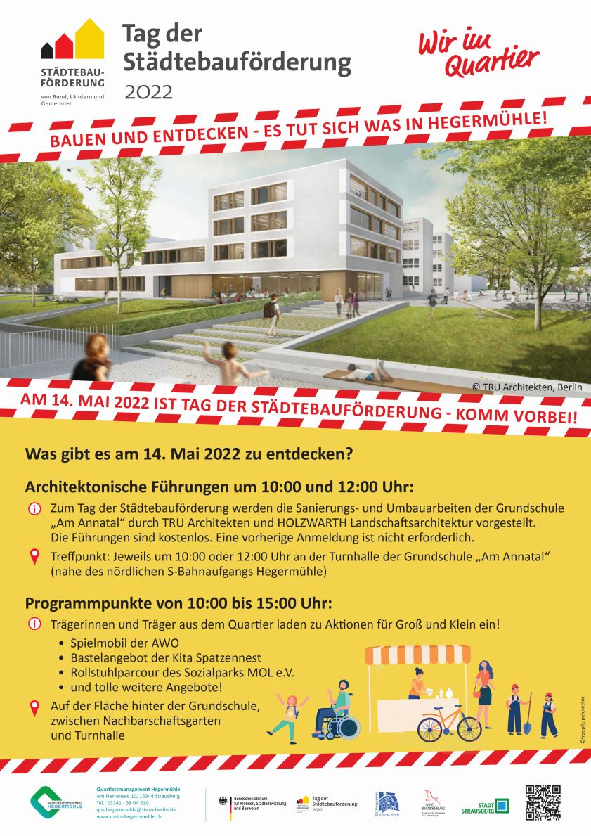 Der diesjährige bundesweite Tag der Städtebauförderung findet 2022 endlich wieder in Präsenz statt. Auch im Fördergebiet Strausberg Hegermühle kann am 14. Mai 2022 das Stadtteilfest von 10:00 bis 15:00 Uhr auf der Fläche hinter der Grundschule „Am Annatal“ zwischen Nachbarschaftsgarten und Turnhalle besucht werden.