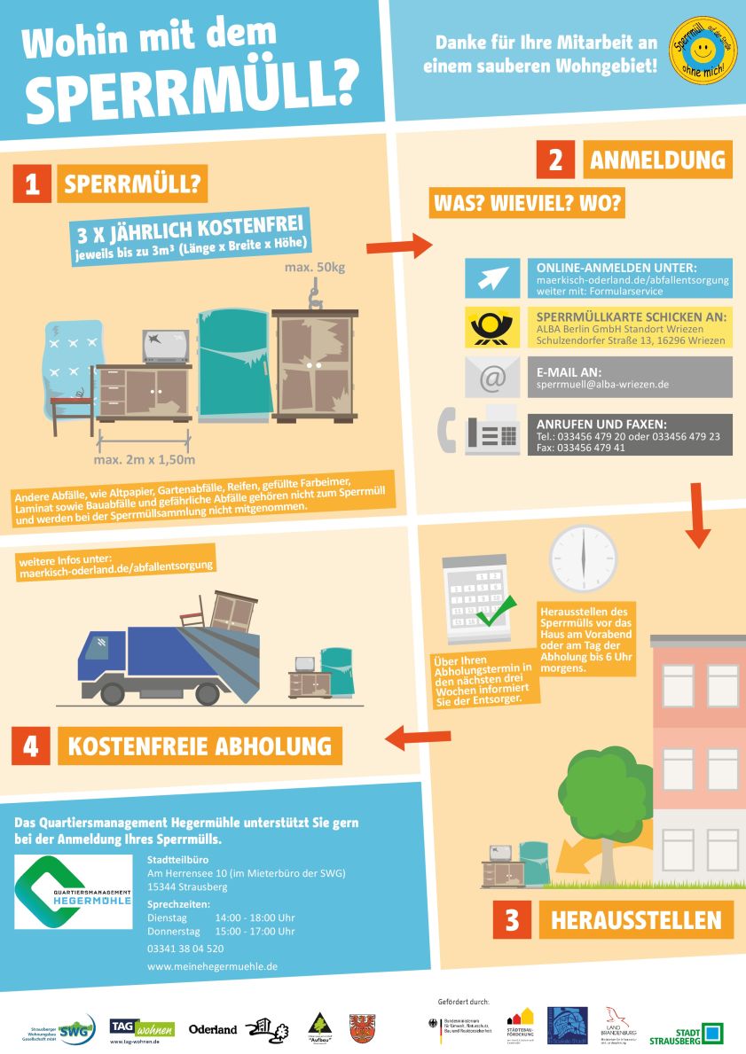 Zusätzlich informiert das Plakat der AG-Sperrmüll, welches in allen Hauseingängen im Wohngebiet aushängt, seither über die Anmeldung und kostenfreie Abholung von Sperrmüll. Bewohnerinnen und Bewohner können bis zu drei Mal im Jahr kostenfrei eine haushaltsübliche Menge Sperrmüll anmelden und abholen lassen.