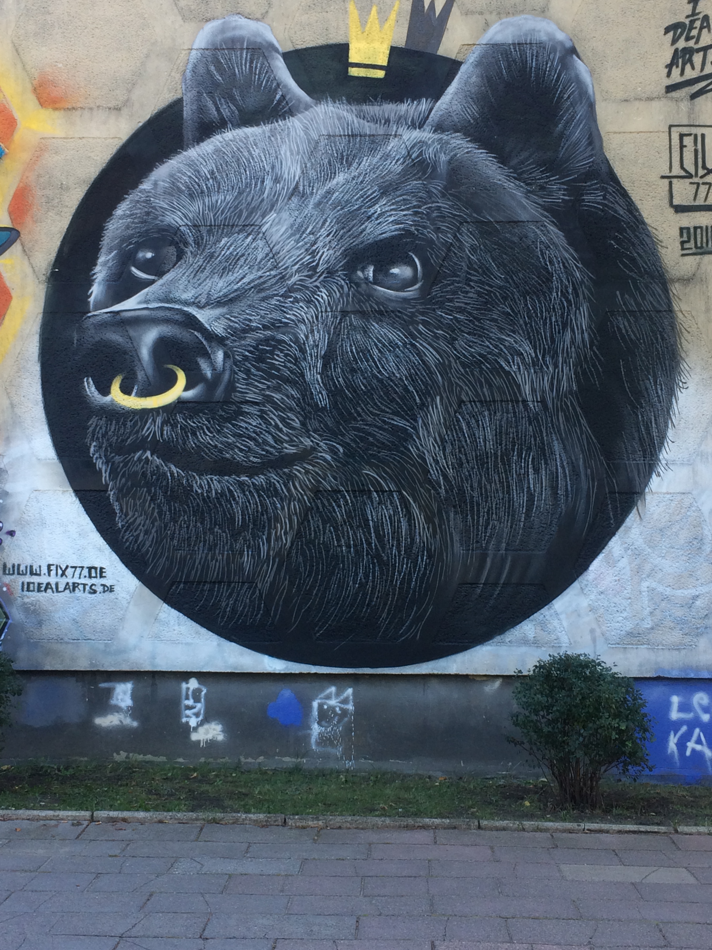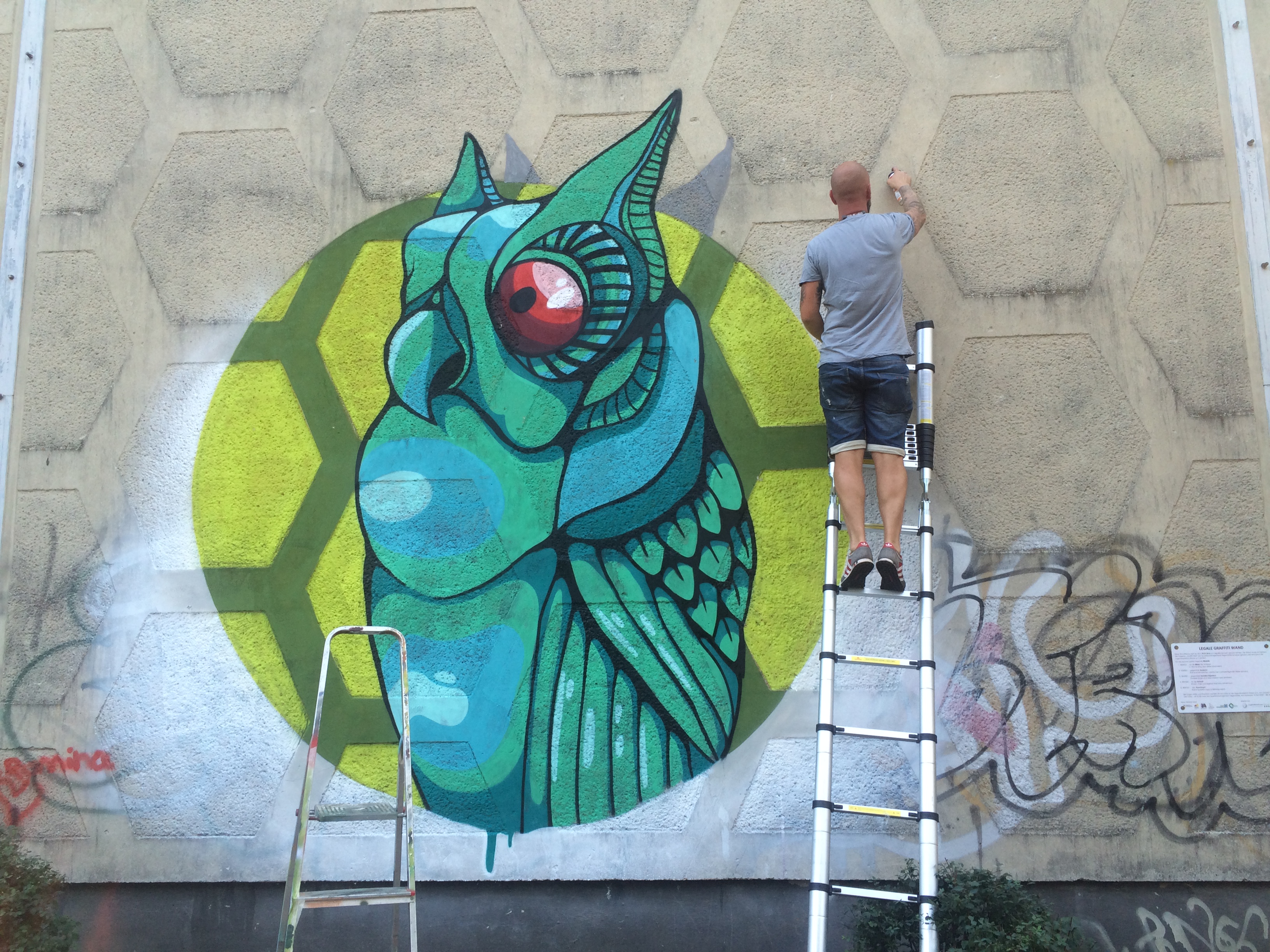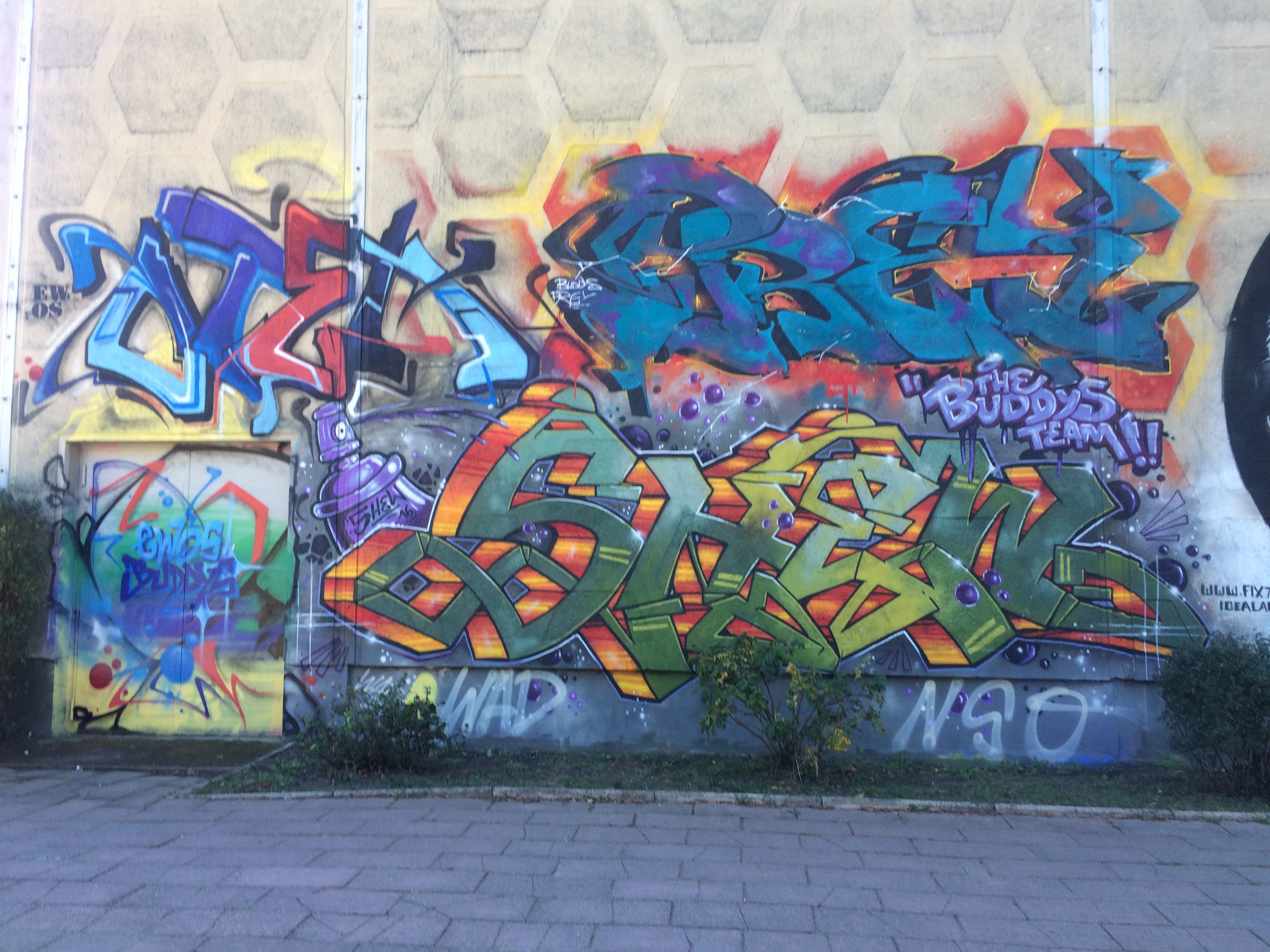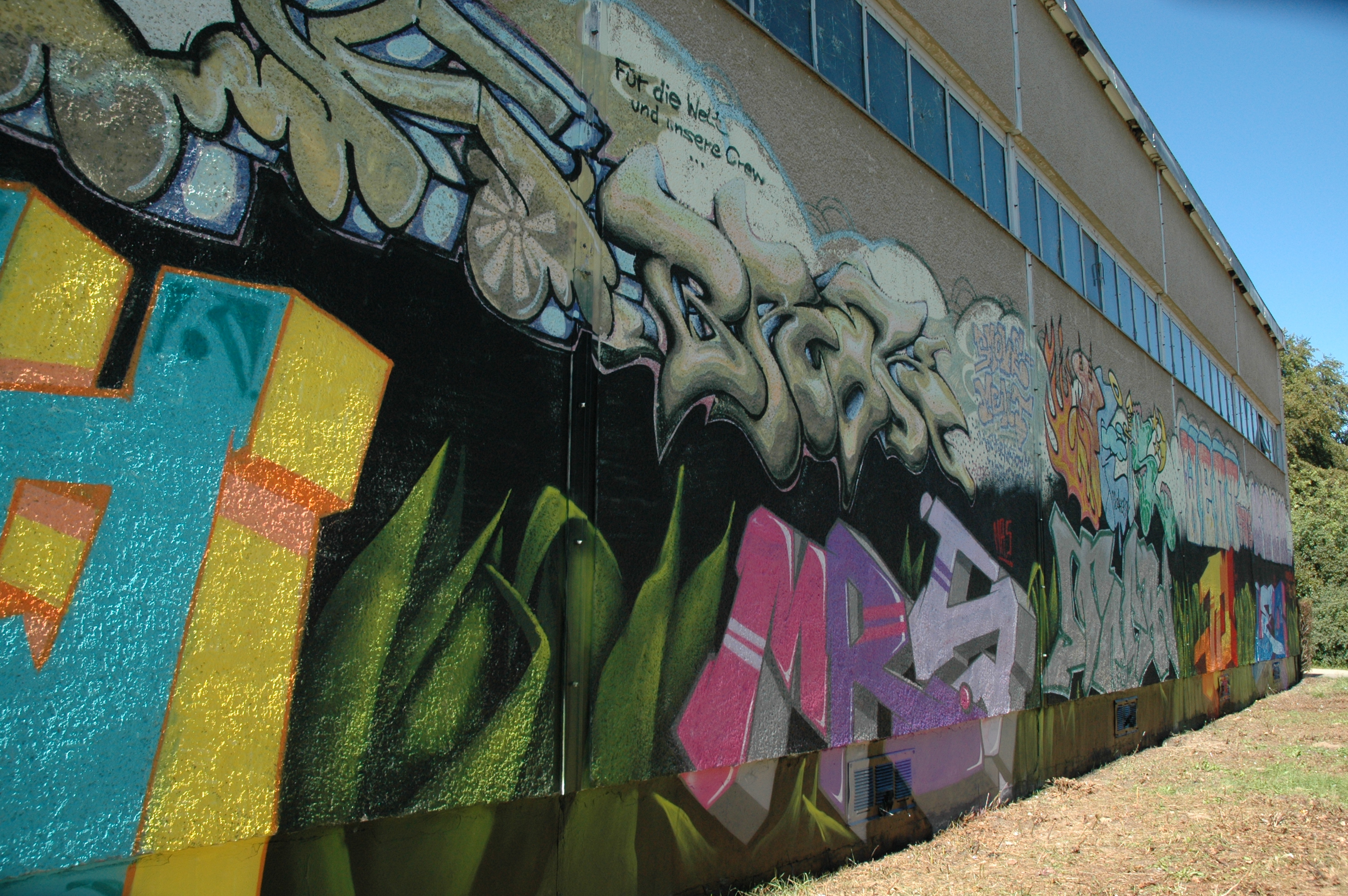 Erreicht man Hegermühle mit der S-Bahn, so läuft man unweigerlich an der Turnhalle vorbei, deren Wände an zwei Seiten seit Spätsommer 2016 durch junge Graffiti-Künstler gestaltet werden.