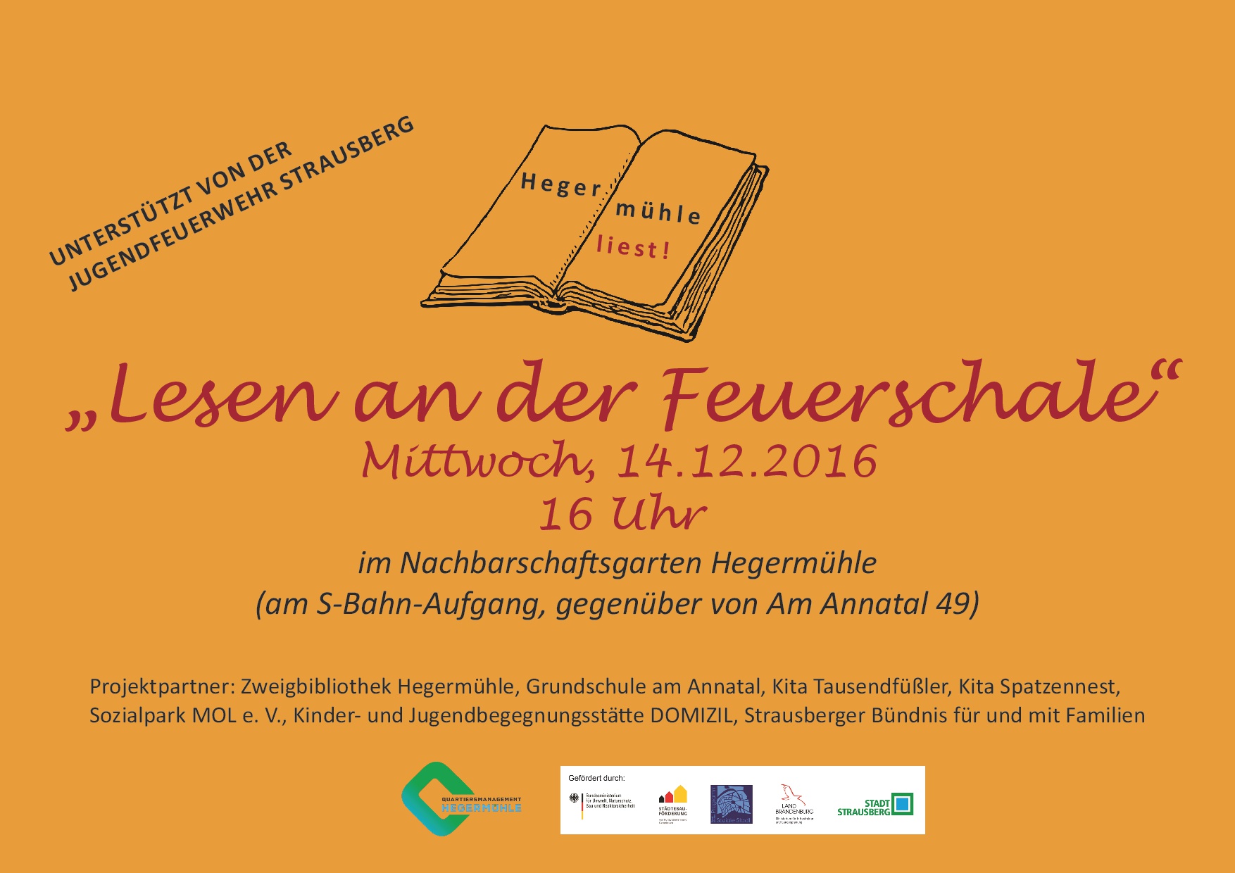 Im Rahmen von "Hegermühle liest!" werden bereits vorhandene Angebote der Projektpartner in Hegermühle zum Thema Lesen und Vorlesen gebündelt und u. a. mit einem regelmäßig erscheinenden Lesekalender publik gemacht. Die Projektpartner koordinieren und stärken in diesem Netzwerk die bereits vorhandenen Strukturen und entwickeln gemeinsam neue Angebote und kleine Veranstaltungen zur Leseförderung und Stärkung der Lesekompetenzen. Das Lesejahr 2017 beschlossen die Projektpartner mit "Lesen an der Feuerschale" mit Punsch und heißer Schokolade im Nachbarschaftsgarten.