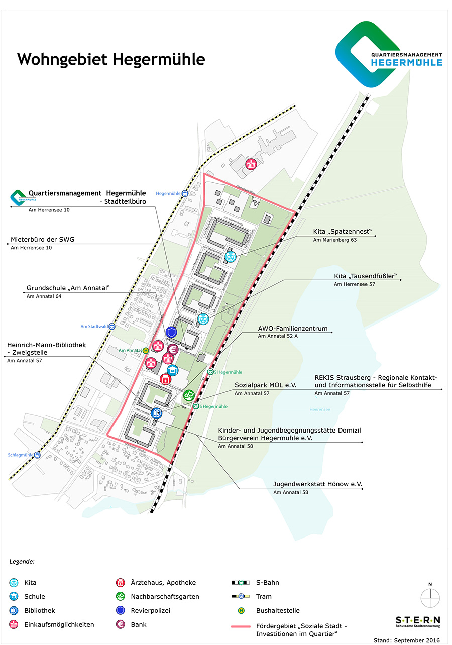 Das Gebiet des Quartiersmanagements erstreckt sich auf das Strausberger Wohngebiet Hegermühle. Es liegt im südlichen Teil der Stadt Strausberg und wird im Norden durch das Handelszentrum, im Osten durch die S-Bahnlinie S 5 und dem anschließenden Waldgebiet Herrensee, im Süden durch die Garzauer Straße und im Westen durch die Ernst-Thälmann-Straße begrenzt.